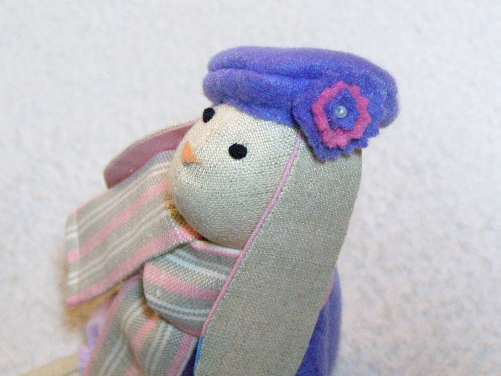 Моя самая первая зайка была сшита больше года тому назад. Тогда,мне казалось, что она вполне гармонична в своей синей панамке и сарафане, но сейчас мне захотелось ее переодеть. Переодеть во что то модненькое. В переодевалки поиграла вчера вечером и вот теперь могу похвастаться ее наряд сегодня. Получилось очень даже моднявая дамочка